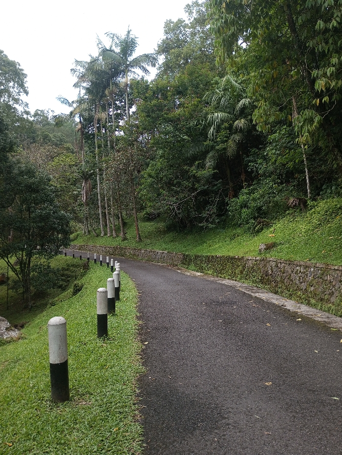 The image displays an asphalt road curving right through a densely vegetated environment in Kanand, India. The dark grey road surface shows minimal debris. Along the road's left edge, a manicured strip of green grass is bordered by a series of eight visible cylindrical bollards, each with a black base and a light grey top, spaced evenly and receding into the background. To the right of the road, a low retaining wall constructed from irregular stone blocks, partially covered in moss, parallels the road's curve. Above this wall, a steep embankment covered in bright green grass rises sharply. The midground and background are dominated by a thick forest consisting of diverse trees and dense foliage, including a prominent line of tall, slender palm trees with feathery fronds in the center-left. The sky is overcast and light grey. No individuals or vehicles are present.