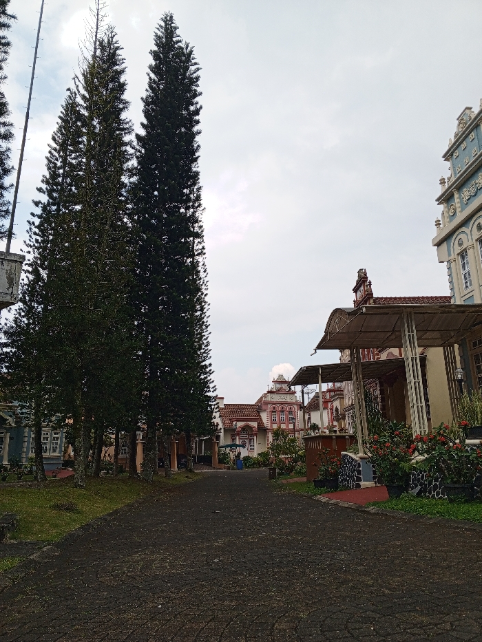 The image captures a paved pathway in the city of Weintiapa, Liberia, under an overcast sky. On the left, a dense cluster of multiple tall, slender evergreen conifer trees with dark green foliage stands on a grassy area, some extending beyond the top of the frame. A thin, vertical pole is partially visible on the far left. On the right, a sequence of multi-story buildings displays elaborate, European-inspired architecture with ornate gables, decorative facades, and reddish-brown tiled roofs. The closest building on the right features a light-colored exterior with a blue and white decorative gable and two covered patio structures supported by white vertical beams. Beneath these patios, garden beds contain green plants and red flowering shrubs in black planters. Further along the path, additional buildings in similar architectural styles are visible, exhibiting varied facade colors such as pink and white, and red and white, with one structure featuring a visible clock face. A small green umbrella is positioned in front of one of the mid-ground buildings. The dark-colored paved path, possibly patterned concrete or asphalt, extends from the foreground into the distance, curving slightly to the right. No individuals are discernible within the scene.