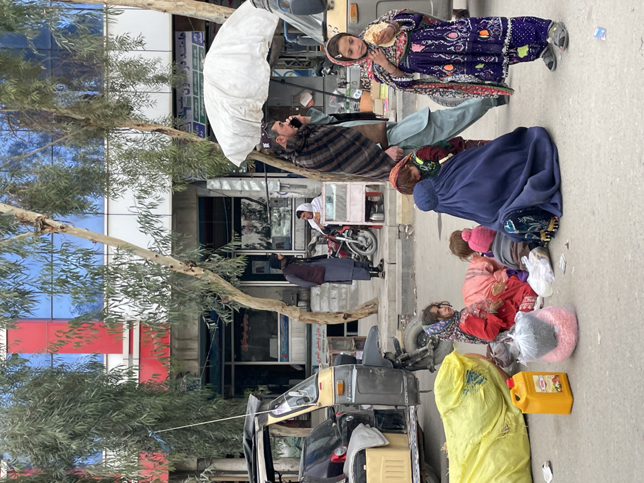 This image depicts a street scene in Kandahar, Afghanistan. In the immediate foreground, a group of approximately five to six individuals, primarily children, are situated on the asphalt pavement. One girl, wearing a purple dress with colorful embroidery, stands on the right, holding and eating a piece of flatbread. To her left, a woman in a dark blue burqa kneels, attending to a small child wearing a pink knit hat. Further left, another girl in a red dress sits on the street, near a bright yellow plastic bag, a yellow jerry can, and several clear plastic bags containing various goods, including a bag of pink items. Scattered debris and small pieces of paper are visible on the street. In the midground, a man wearing a plaid scarf and a light-colored cap stands, engaged in a phone call, positioned to the left of a white vendor's umbrella. An auto-rickshaw, light tan and grey, is parked on the left side of the street. On the sidewalk behind the street-level activity, two men are visible: one man in dark traditional clothing stands, while another man in a white turban sits on a red motorcycle next to a small, light-colored vendor cart. The background features a multi-story commercial building with a modern facade incorporating red and blue reflective window panels. Several slender trees with light green foliage partially obscure the building. Below, street-level shops with signage in local script are visible, displaying items through glass windows. The overall lighting is diffuse, suggesting an overcast sky.