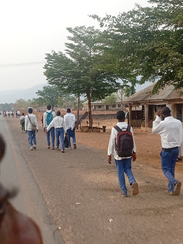 - "group of 11 young men walking down a paved road in Ubbe, Nigeria (latitude: 8" by FM-5D8LB2, licensed under CC BY 4.0