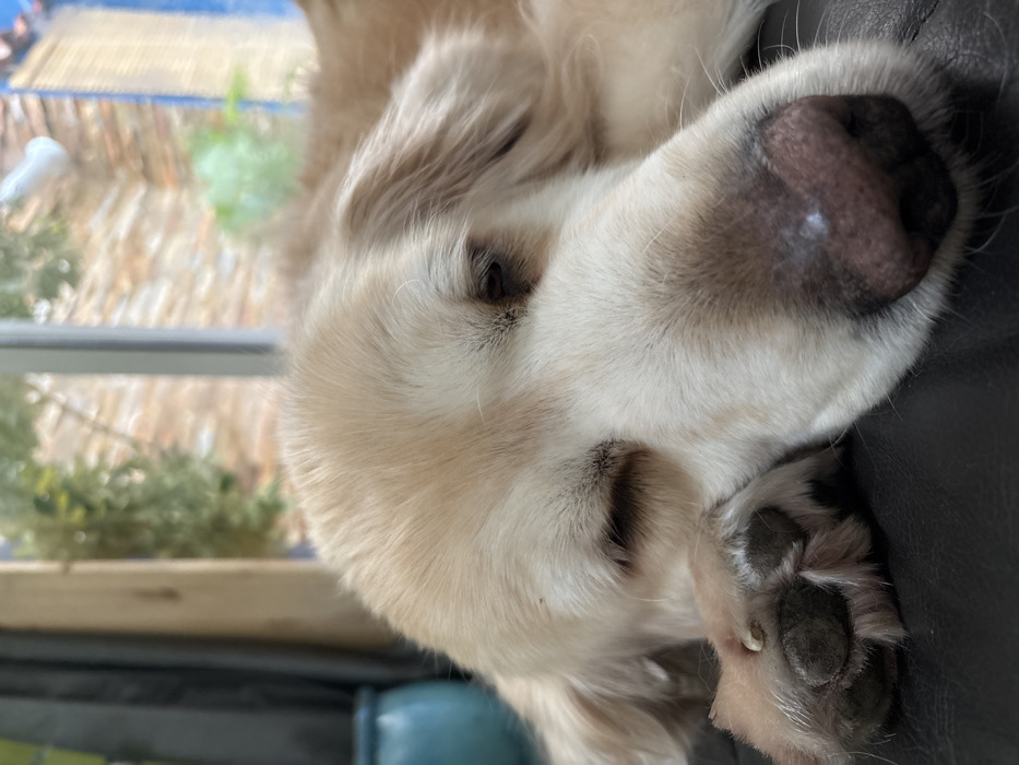 - "A cream-colored Golden Retriever dog is depicted in a close-up, horizontal orientation, resting on a dark, possibly leather, surface with its eyes closed, indicating sleep or repose" by FM-wE9nL2, licensed under CC BY 4.0