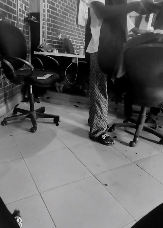 The video depicts a barber providing a haircut in a small barbershop. The barber, dressed in patterned pants, a white shirt, and a black apron, uses clippers to style the hair of a seated customer whose back is to the camera. The shop has a brick wall, a rolling office chair, and a white table with various barbering supplies. Hair clippings are visible on the tiled floor. The scene is recorded in black and white.
