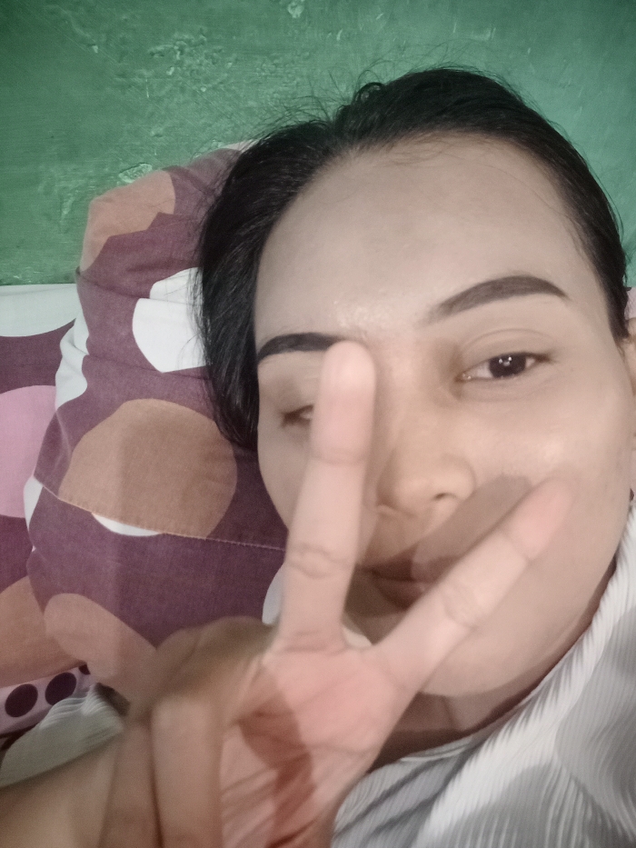 A person is seen in a close-up selfie, flashing a peace sign with their fingers. They are lying on a bed with a patterned pillow behind their head. The background appears to be a green wall. The person has dark hair pulled back from their face, dark eyebrows, and appears to be wearing a white shirt. The lighting is slightly dim.