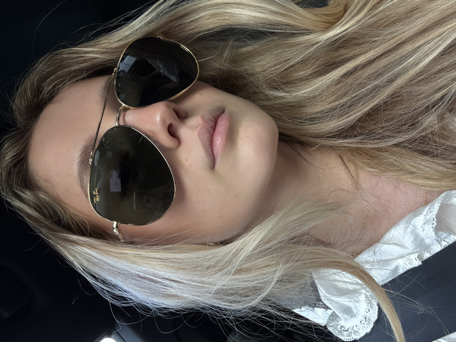 An individual with fair skin and long, wavy blonde hair is depicted from the mid-chest upwards, seated within a vehicle. The subject wears gold-framed aviator-style sunglasses with dark tinted lenses; the "Ray-Ban" logo is visible on the upper left lens. A white garment with a ruffled or lace-trimmed collar is visible, partially covered by a dark-colored seatbelt diagonally traversing the left side of the frame. A thin, delicate chain necklace is present around the neck. The lips are closed. Reflections in the sunglass lenses show a person holding a smartphone, indicating a selfie, and indistinct outdoor elements, potentially a street scene or architectural features. The vehicle interior forms an out-of-focus, dark background. No specific geographic landmarks are discernible to pinpoint a precise location within Miami, United States of America.