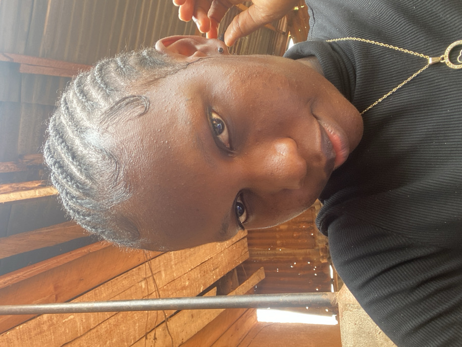 The image presents a close-up portrait of a young female located in Ojoto, Nigeria. She has dark skin, dark eyes, and her hair is styled in tightly braided cornrows with defined baby hairs along the hairline. She is wearing a black ribbed turtleneck top and a gold-colored chain necklace featuring a heart-shaped pendant. A small, dark stud earring is visible in her right earlobe, and her right hand is partially visible, positioned near her right temple. The background consists of exposed wooden planks above, a vertical metal pole on the left, and a rusted corrugated metal sheet on the right, suggesting a semi-outdoor or basic indoor structure. Bright, natural light illuminates the scene, appearing to originate from the left.
