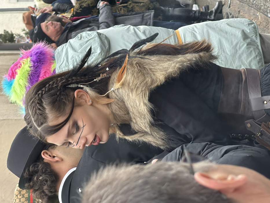 The image depicts a public gathering in Irsch, Germany, featuring multiple individuals, primarily focusing on a young female in costume. This central figure is shown in left profile, with dark hair styled in braids, adorned with several black and brown feathers, silver-toned beads, and small white elements. Her face exhibits black linear markings: one horizontal above the left cheekbone, one angled beneath the left eye, one horizontal on the chin, and a vertical mark on the lower lip. She is dressed in a black long-sleeved garment topped with a light brown, fur-trimmed vest and a wide, dark brown corset or belt featuring lacing and a small dark brown pouch on her right hip. Her mouth is partially open. In the immediate foreground, obscuring part of the central figure, is the back of a male's head with grey hair and glasses. Directly behind the central figure is a male wearing a black suit and a black fedora-style hat. Above and slightly behind him, the back of another person's head shows a brown cap with a repeating pattern. To the right of the central figure, a person is visible wearing a multi-colored (pink, green, blue, yellow) faux fur hat and a light-colored, possibly light blue or green, puffy jacket. Further right, a male with a black beanie and dark jacket is seen in right profile, holding a clear plastic cup and exhibiting a slight smile. The background consists of a light-colored building wall and a dense crowd of additional individuals, some in casual winter wear, others in various costumes, indicative of a parade or festival setting.