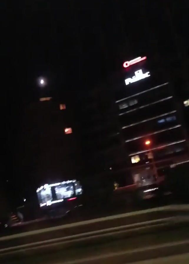 The camera moves quickly along a highway at night. On the right is a tall building with a red and white sign that reads "Procredit." Other buildings are visible, but are more distant and difficult to make out. The moon is also visible in the sky. The camera is shaky, and the focus is not sharp, but the overall image is of a city skyline at night. The highway is illuminated by streetlights and car headlights.
