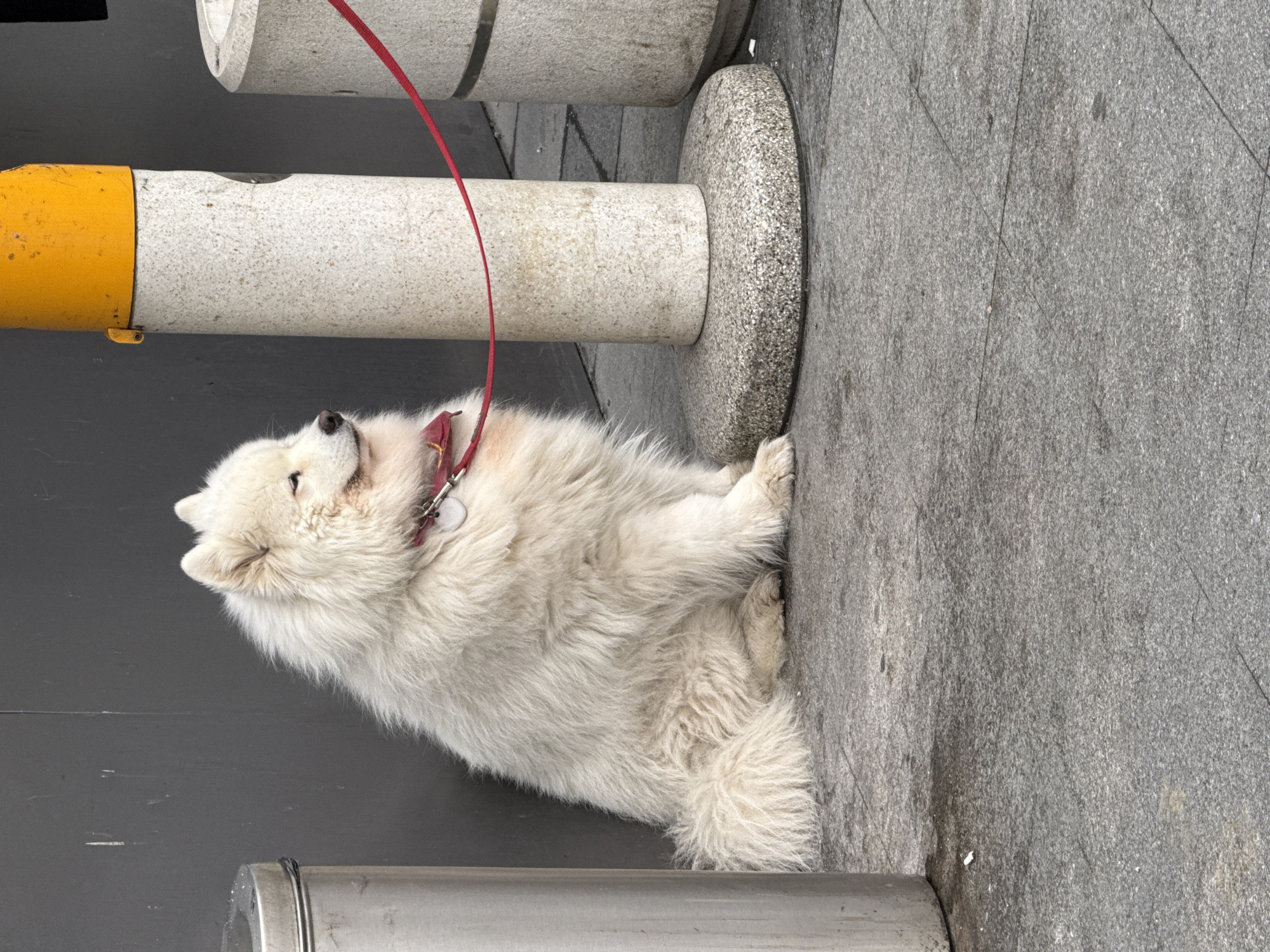 The scene depicts an urban outdoor environment, specifically a paved pedestrian area in Sofia, Bulgaria. A white, long-haired Samoyed-type dog is seated upright on grey flagstones, facing right. The dog wears a red collar with a round silver identification tag, and a red leash extends from its collar, secured around a light grey, granular-textured cylindrical bollard topped with a distressed yellow section. This bollard features a horizontal slot near its top. To the dog's left, a tall, narrow, silver-colored metal cylinder, possibly a public waste receptacle or bollard, is positioned. A dark grey, possibly metallic or painted wall forms the background behind the dog and the silver cylinder, showing faint vertical scuff marks. Further to the right, a second, wider grey cylindrical structure is partially visible behind the primary bollard. The grey pavement shows minor staining and contains scattered small debris, including a single white cigarette butt near the base of the silver cylinder. No human subjects are present in the image.
