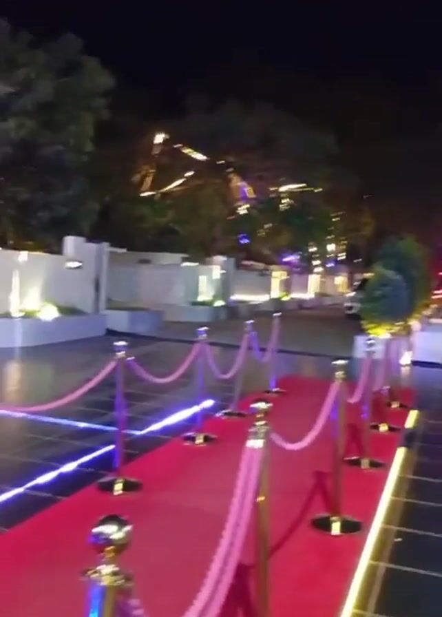 nighttime shot of a red carpet event with a black SUV parked nearby. The red carpet is lined with gold stanchions and pink rope, with blue lighting outlining the black tiled walkway. In the background, there are trees and white buildings illuminated with warm lights. A man in a white outfit walks in the background. The sound indicates music is playing.