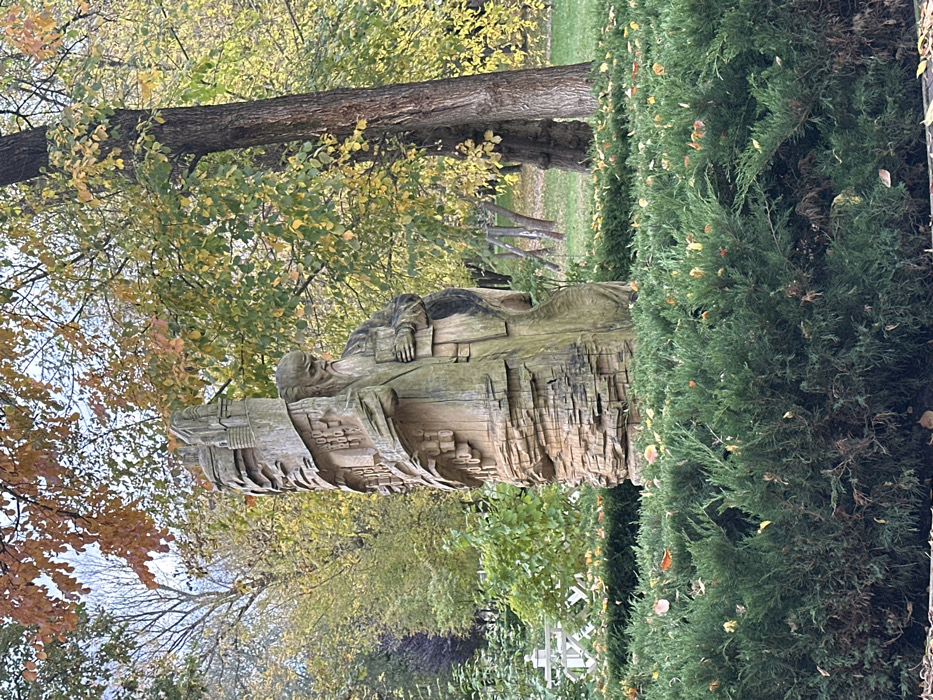 A forensic description of the image reveals a tall, weathered wooden sculpture positioned in a park in Irpin, Ukraine