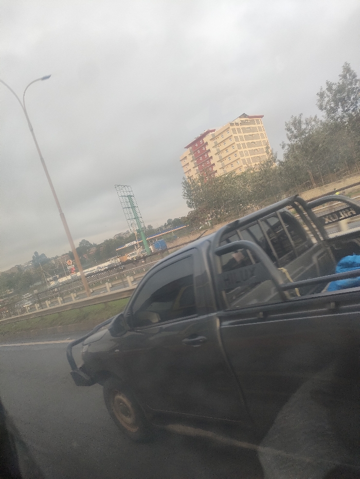 The image presents an outdoor scene captured from a moving vehicle in Murera ward, Kenya, under an overcast sky. The immediate foreground features the passenger side of a dark-colored Toyota Hilux pickup truck, equipped with a black front bull bar and a black roll bar over the bed, which contains a blue tarp or bag. The visible front wheel of the pickup truck has a discolored steel rim. To the left, a tall, slender streetlight pole with a curved arm rises. Beyond the immediate lane and separated by a concrete barrier, a multi-lane highway is visible. Across the highway, a prominent multi-story building, estimated at 8-10 floors, displays an alternating facade of red and light-colored sections, topped with a distinctive curved roof. This building is partially obscured by trees. Further left and in the distance, a tall green metal framework, resembling an incomplete or deconstructed billboard, stands. The background shows a varied landscape with additional urban infrastructure, faint buildings, and distant hilly terrain. No individuals are clearly discernible.
