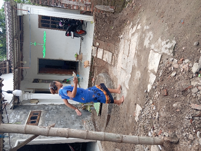 A woman in a blue dress stands on a dirt and concrete-paved area, holding a phone and facing away from the camera. Behind her is a white building with a porch, supported by columns. A motorcycle is parked on the porch. An object hangs from a clothesline. A bamboo pole is in the foreground on the bottom of the frame.