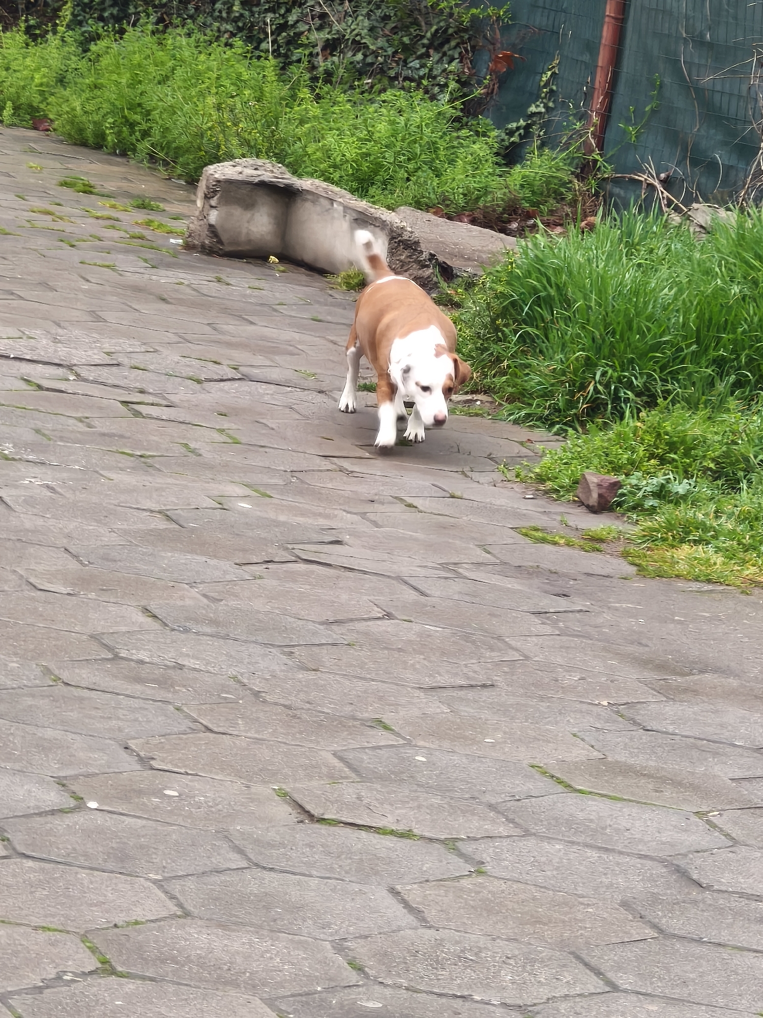 A medium-sized, brown and white dog is walking on a paved walkway composed of irregularly shaped, gray stones. The dog is moving towards the viewer. Behind the dog, there is a concrete structure and a grassy area with green vegetation. A fence is visible in the background. The location appears to be an outdoor area, possibly a park or residential area, based on the greenery and fencing. The image does not offer enough context to confirm that it is in Plovdiv, Bulgaria.