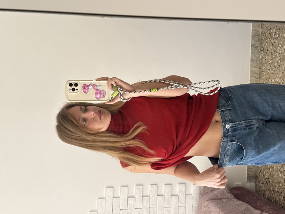 The image depicts a female subject capturing a mirror selfie inside a room in Anzio, Italy. The subject has light brown hair and is wearing a red sleeveless turtleneck top and blue denim jeans. She holds the waistband of her jeans with her left hand, pulling it away from her body to reveal her midriff and demonstrate the garment's loose fit. Her right hand holds a beige smartphone, fitted with a clear case featuring a pink stiletto sticker on the back, pointed towards the mirror. A multi-colored lanyard, composed of black, white, and green segments with a yellow smiley face bead, is attached to the phone case and hangs down. The reflected background includes a plain white wall, a section of which on the left exhibits white brick-patterned tiling. A portion of a bed with a pink/mauve quilted comforter is visible on the far left. The floor is a light-colored, speckled tile surface. A vertical white architectural edge, possibly a door frame, is present on the far right of the reflection.