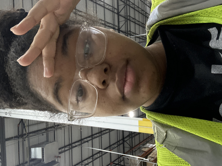 A mid-shot image captures an individual, identified as female, with dark skin and dark, curly hair styled in an updo, wearing clear-framed glasses. She looks forward with a neutral expression. Her right hand rests with fingers splayed against her forehead. She is attired in a black t-shirt beneath a neon green safety vest featuring grey reflective panels. The background reveals an indoor industrial facility, located in Pineville, United States. Visible structural elements include a high ceiling with exposed metal trussing and several overhead light fixtures. A white support pillar with a yellow base strip, marked "B 25" vertically, is positioned to the left. In the blurred far background, industrial shelving units are partially visible. The scene is evenly illuminated by artificial lighting.