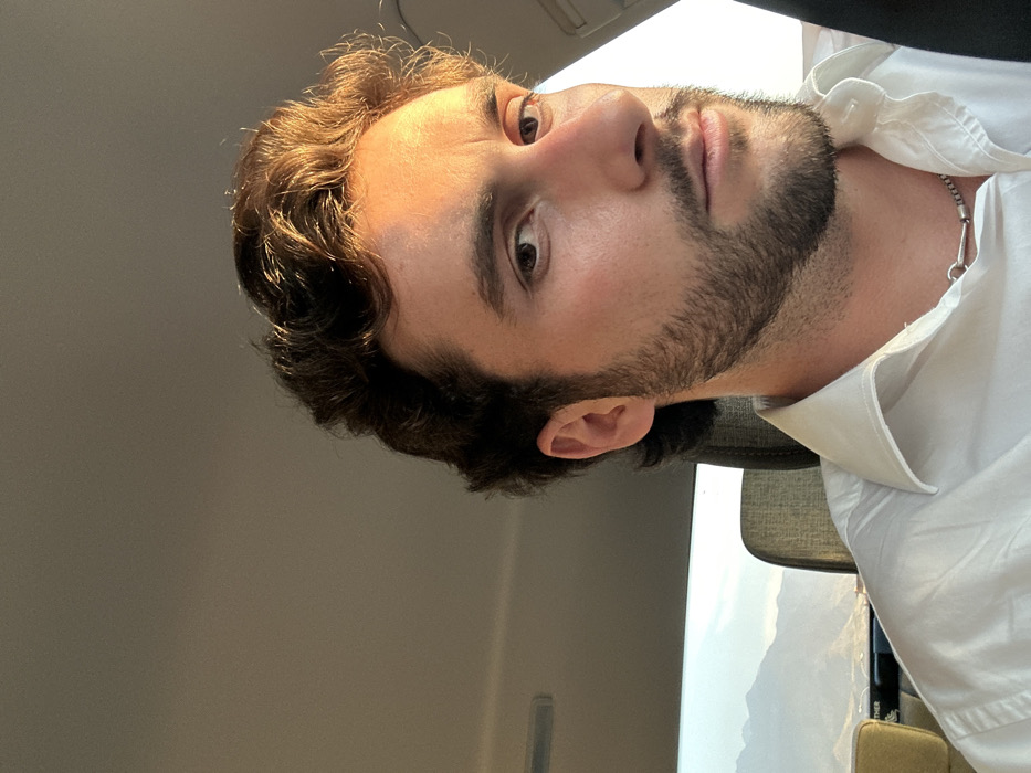 A light-skinned man with dark, wavy hair and a neatly trimmed beard poses in a white collared shirt