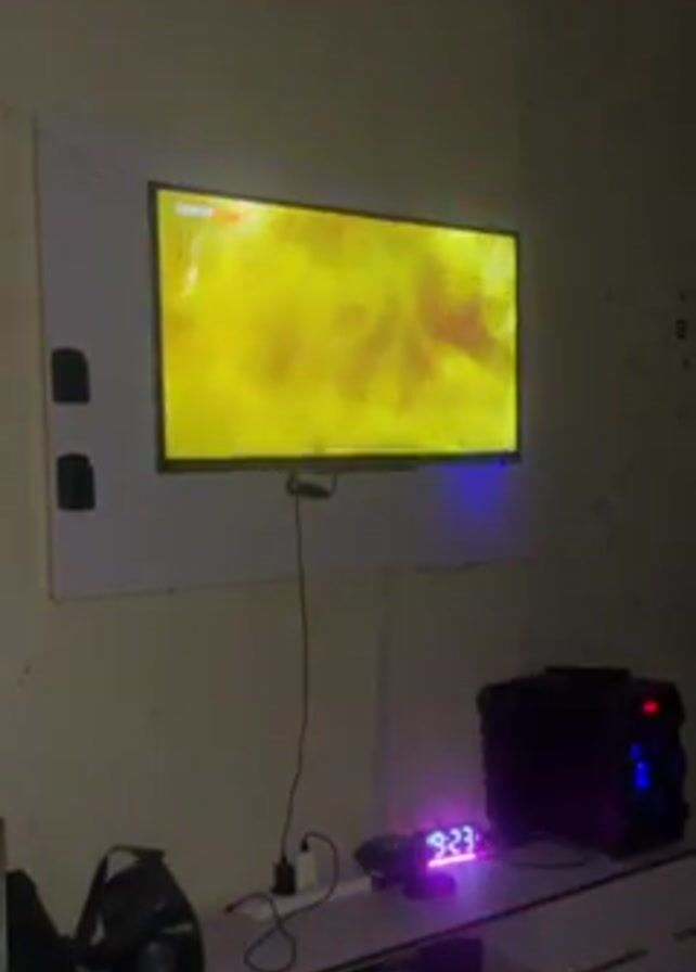 A TV is mounted on a wall in a room, displaying a yellow and brown image with some indistinguishable action