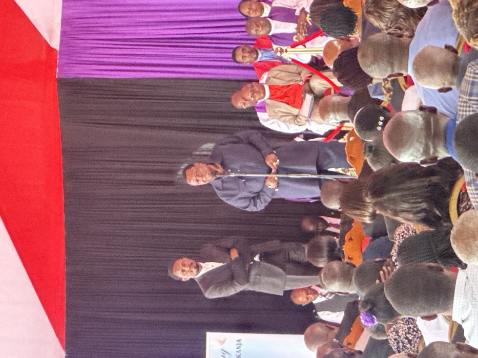 The image captures an indoor event in Thuthuriki, Kenya, under a red and white striped canopy