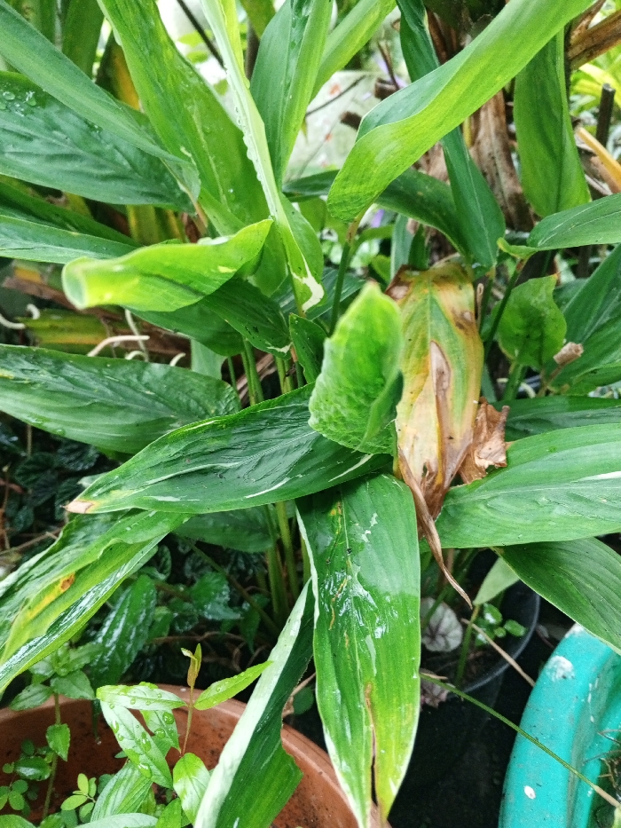 The image displays a close-up of a leafy plant, located in Phoukhoun, Laos. The dominant subject is a plant featuring numerous elongated green leaves, many of which are covered with visible water droplets. Several leaves exhibit variegation with lighter green or white streaks. Towards the center-right, a singular leaf displays significant browning and yellowing, indicative of decay or desiccation. In the lower-left corner, the rim of a terracotta-colored pot is partially visible, containing soil and several small green sprouts. The lower-right portion of the frame shows a curved, light blue plastic object, likely a pot or container, with scattered white marks. The background consists of blurred, dense green foliage. No human figures or overt actions are present in the scene.