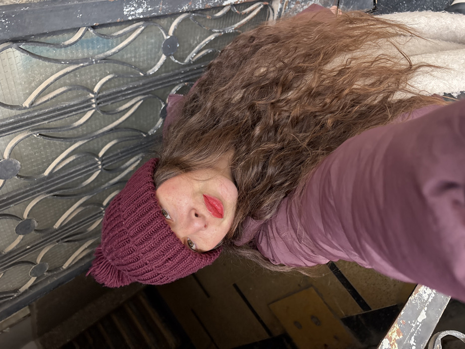 This image depicts a female individual in a close-up, selfie-style portrait taken indoors in Meknes, Morocco. The subject is a young adult with long, wavy, dark brown hair. She is wearing a dark red knitted beanie with a prominent pom-pom, which is pulled down to partially obscure her forehead and left eye. Her lips are adorned with red lipstick. She is dressed in a dark red puffer jacket, with a portion of a light-colored, textured garment visible beneath it on her right side. The background to her left reveals a dark staircase or hallway with visible patterned floor tiles in dark and light tones. To her right, a decorative, dark-colored metal gate featuring scrollwork designs is present. A worn, light-colored metal railing is visible in the lower-left foreground. The subject looks directly at the camera.