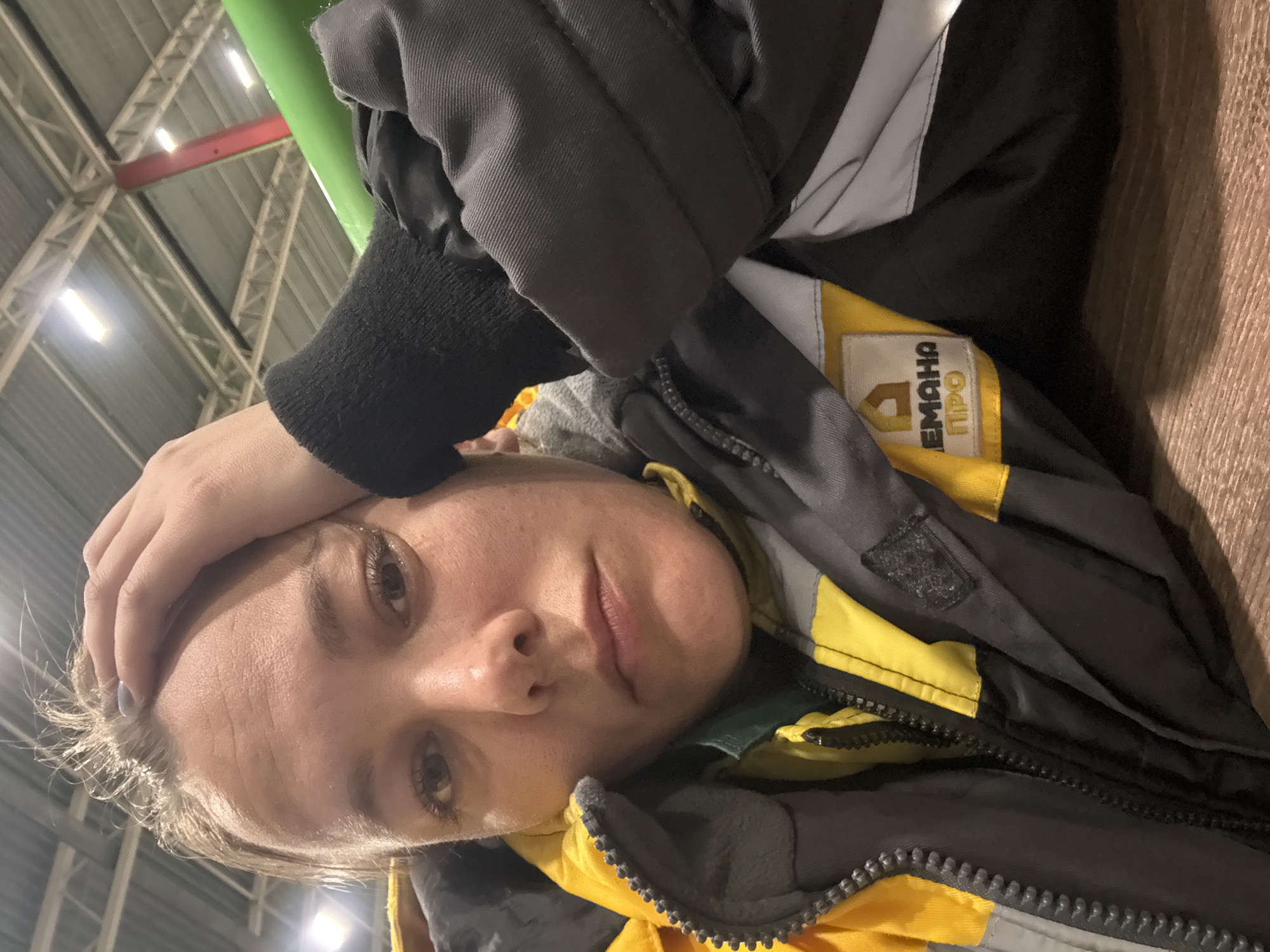 person with fair skin and light brown hair, wearing a black and yellow jacket with a logo that reads "ЕМАHA ПРО". The person is holding their forehead with their left hand. The background shows a high ceiling structure with metal beams and artificial lighting, suggesting an indoor location, potentially a sports facility or warehouse. Given the presence of the Cyrillic logo, and the request to locate this in Lupanovo, Russia, it suggests this individual is inside some building in that town. The presence of a warm jacket also indicates this is the winter months in the cold region of Russia.