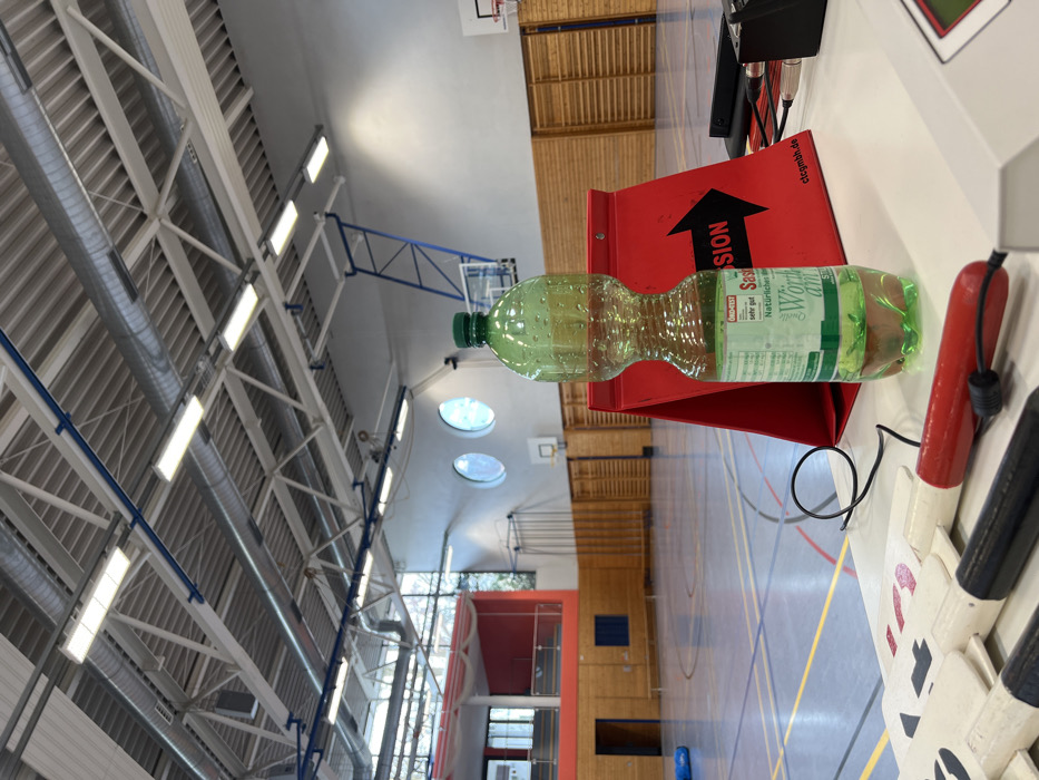 The scene depicts the interior of a brightly lit gymnasium or sports hall in Memmingen, Germany, viewed from a low angle, focusing on a foreground surface. In the immediate foreground, a white table or counter displays several items. Centrally positioned is a translucent green plastic bottle, approximately half-filled with a clear liquid. Its label, "Saschinger Schlossquelle Natürliches Mineralwasser," with an "Öko-Test sehr gut" certification, is visible. Behind the bottle stands a red, A-frame sign or display board. A prominent black arrow points to the right on this sign, with the partial text "MSSION" and the URL "ctcgmbh.de" legible. To the left of the bottle, several white wooden handles with black and red accents, resembling jump rope handles or similar equipment components, are arranged on the table, connected by a black coiled cable. To the right of the bottle, a black electronic device and additional cables are present. The midground reveals the gymnasium floor, marked with various colored lines (blue, yellow, red, white) indicating different court boundaries. The floor appears clear of any individuals or active play. The walls feature a lower section of horizontal light wooden paneling, with sections of vertical wooden slats (likely climbing or exercise bars) along the far wall. Two basketball hoops are visible: one with a transparent backboard and blue metal support structure, and another with a white backboard. High on the far wall, two circular windows allow natural light into the space. On the left side, a raised platform or balcony area, bordered by a red safety rail and white netting, is visible. The background shows the gym's high ceiling structure, comprising exposed metal trusses, beams, and large, silver cylindrical ventilation ducts. Numerous rectangular fluorescent or LED light fixtures illuminate the area, and blue piping runs along the ceiling structure. No people are present in the image.