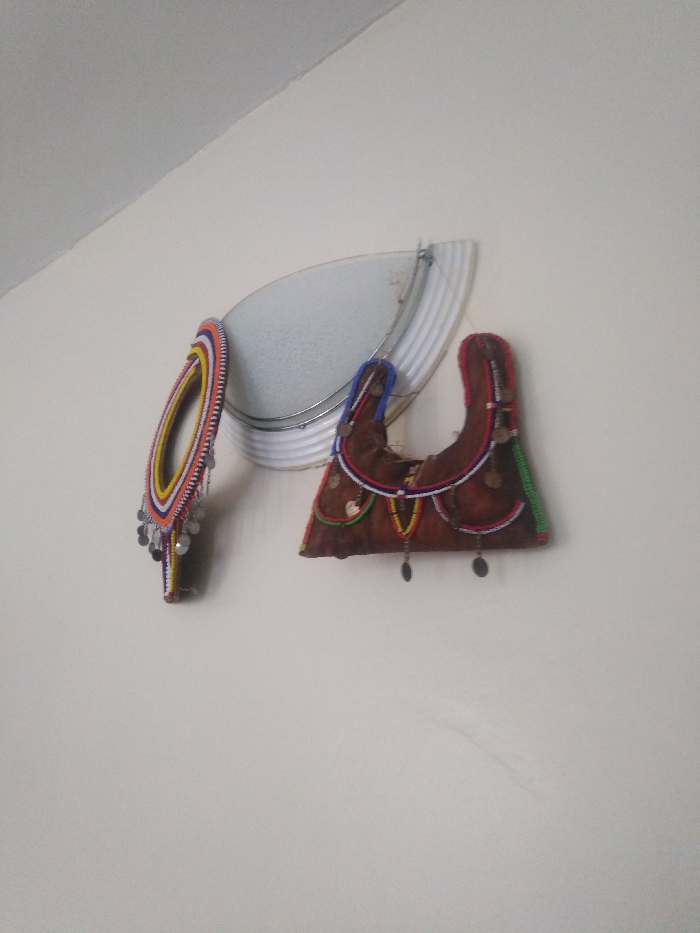 Two beaded tribal artifacts and a lamp fixture adorn a cream-colored wall