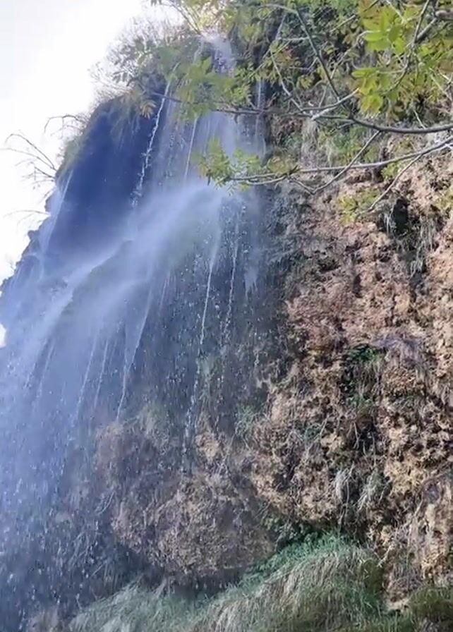 A low-angle shot showcases a tall waterfall cascading down a moss-covered rock face. Thin streams of water create a misty effect as they fall, and sunlight peaks through the water, creating a hazy glow. Green grass grows at the base of the rocks. Branches of a tree, with green leaves, are visible in the upper right corner of the frame. The sky is pale and bright.