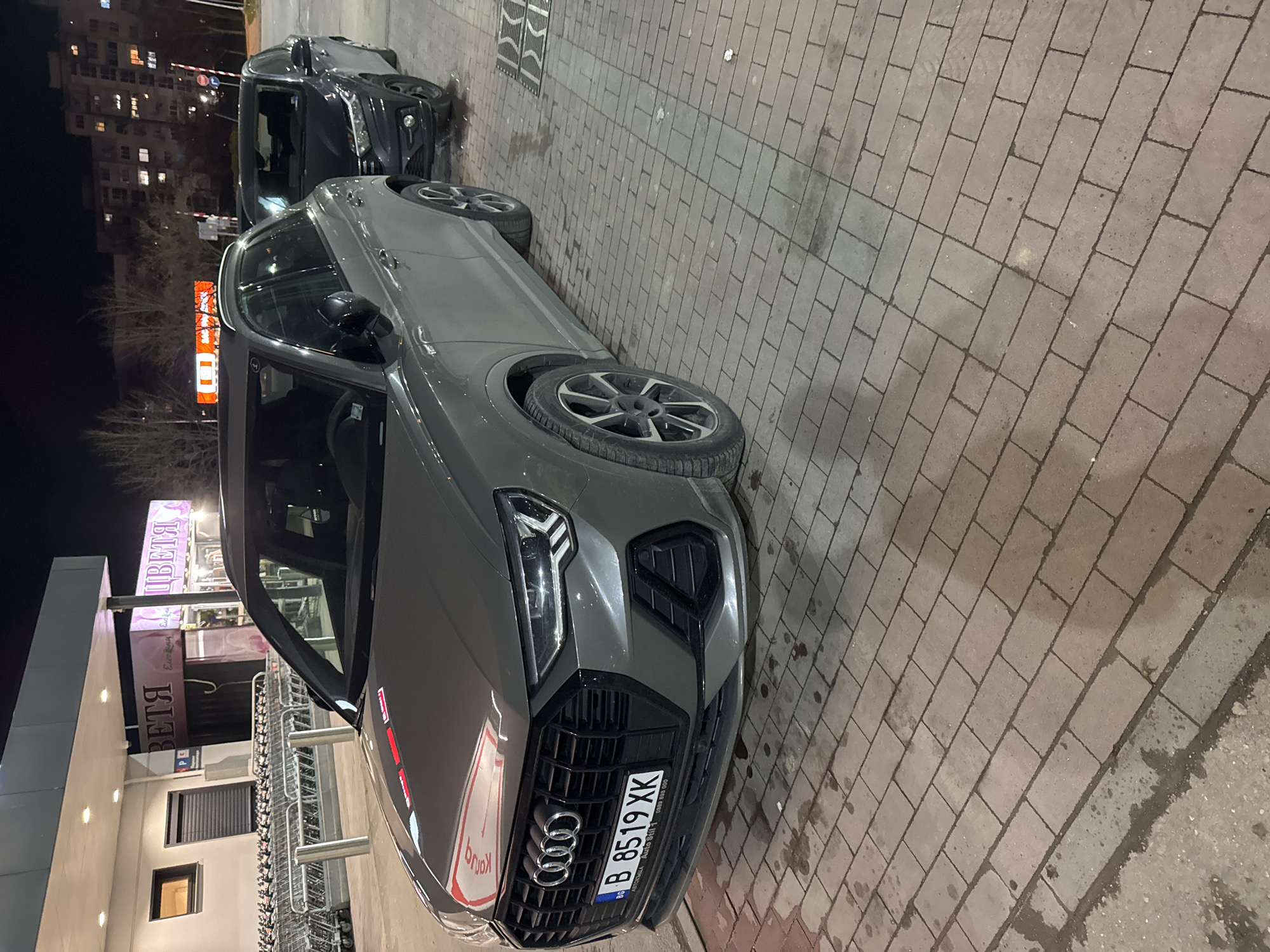 The image captures a nighttime scene in Varna, Bulgaria, depicting an illuminated commercial area. In the immediate foreground, a dark grey Audi Q3 SUV is parked diagonally on a paved surface composed of grey interlocking paver blocks, which show evidence of moisture and grime. The vehicle's front license plate is prominently displayed, reading "BG B 8519 XK", with additional text below indicating "ABTOKЪЩА Auto Still 1" and a phone number. Reflections of red and white light sources are visible on the Audi's hood. Behind the Audi, a dark-colored sedan is parked. To the left of the Audi, under a brightly lit building canopy, numerous metal shopping carts are arranged in rows. Adjacent to this area, a storefront is visible, featuring a large, illuminated pink sign with the Cyrillic word "ЦВЕТЯ" (FLOWERS) and "Елена" (Elena) below it, identifying a flower shop. This location is identifiable as being in Varna due to the "B" on the license plate and the "Auto Still 1" dealership reference, which is located on bul. "Vasil Levski" 100 in Varna. In the distant background, multi-story residential buildings with various illuminated windows are visible against the dark night sky, partially obscured by bare trees. No people are visible in the scene.