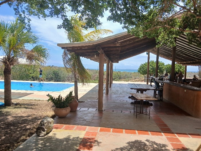 The image depicts an outdoor recreational area in Guayacancito, Venezuela, under clear daylight. The scene features a bright blue swimming pool on the left, where one individual is partially submerged and another person, wearing a dark shirt and light shorts, stands on the tiled deck nearby. Two prominent palm trees flank the pool area. Adjacent to the pool on the right is a large, open-air covered patio with a slatted wooden roof supported by multiple wooden posts. The patio floor is a mix of tan and reddish-brown tiles. Within this covered area, a long, curved bar counter with a textured, terracotta-colored finish is visible on the right. Several individuals, approximately 5-7, are present under the patio, some standing near the bar and others seated at various wooden tables. At least two unoccupied wooden tables are centrally located on the patio. Beyond the pool and patio, a dense band of green coastal vegetation precedes a body of water, identifiable as the ocean, under a partly cloudy sky. A large, grey rock and two potted plants are visible on the ground in the immediate foreground, transitioning from sparse grass to the tiled patio.