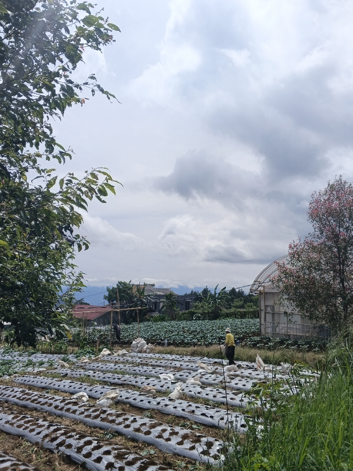 An outdoor, wide-angle image depicts an agricultural landscape in ឃុំ ផាត់សណ្ដាយ, Cambodia, under an overcast sky. In the immediate foreground, dense green tree foliage frames the left side, while tall green grass and a tree with pinkish-red leaves are visible on the right. The midground features multiple parallel rows of cultivated land, each covered with black plastic mulch and showing small green plants emerging through perforations. Several white bags, possibly containing fertilizer or harvested produce, are distributed across these rows. One individual, dressed in a yellow long-sleeved shirt, dark trousers, and a light-colored hat, stands or walks within the cultivated field, holding a dark stick or tool. Behind this person, a large, dense field of green, leafy crops extends. To the far right, a white, semi-circular greenhouse structure with a translucent roof is present. The background reveals multiple residential structures with distinct rooftops, surrounded by dense green vegetation, with distant mountains or hills faintly visible beneath a light grey, cloudy sky.