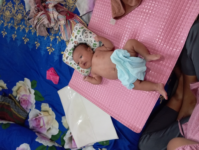 An indoor scene in Waung, Indonesia, depicts an infant lying supine on a pink, rectangular, textured changing mat