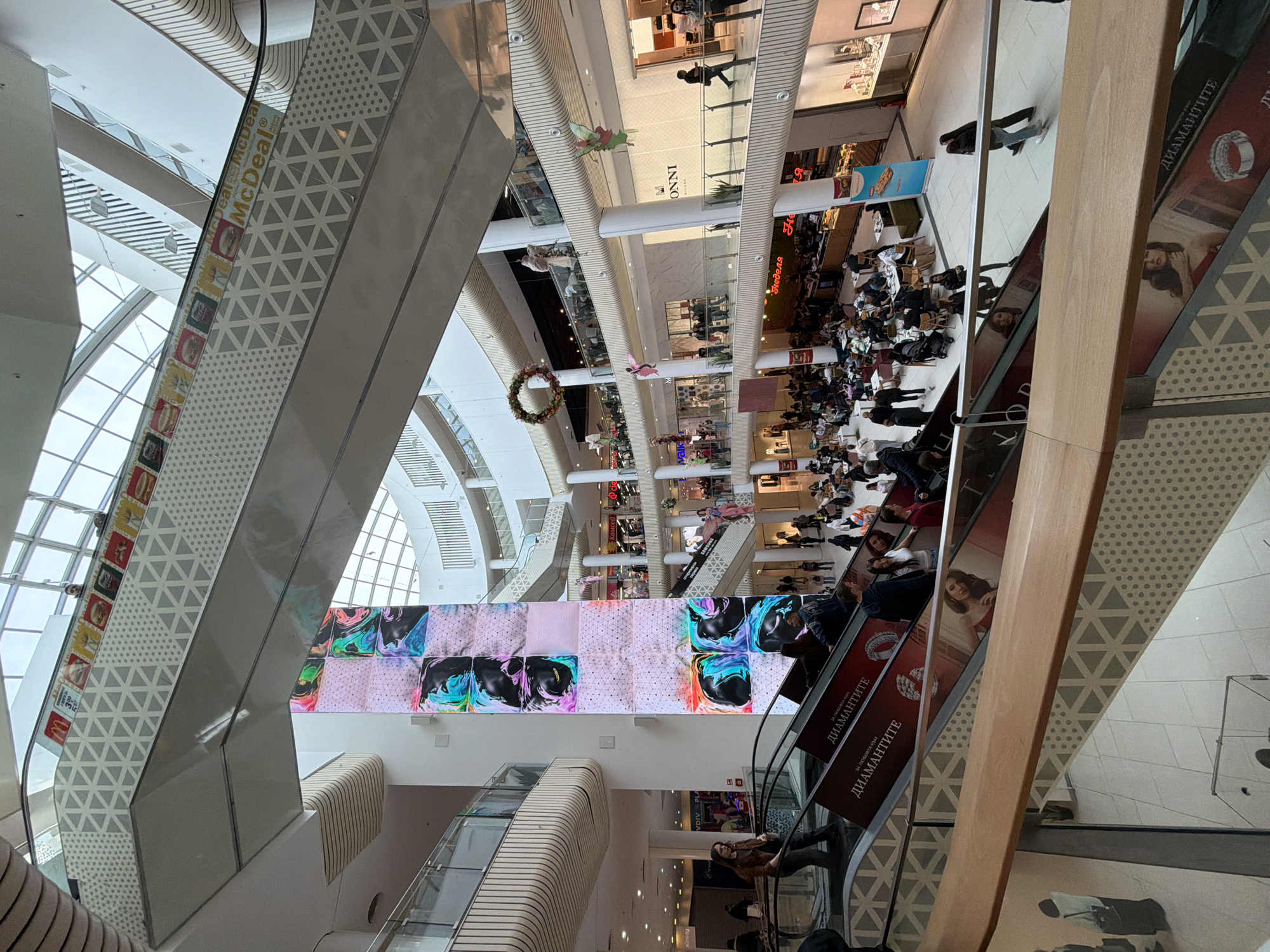 This image depicts the multi-level interior of the Plovdiv Plaza Mall in Plovdiv, Bulgaria. The central atrium is illuminated by a large glass skylight and traversed by multiple escalators. A prominent, tall, vertical LED screen displays abstract, vibrant, swirling patterns in the center of the scene. On the lowest visible floor, a food court area is present with numerous tables and chairs, occupied by patrons. Surrounding retail spaces are visible on all levels, identified by signs such as "ONNI," "KOSMETIKA," and "SAMSUNG." Escalators feature advertisements on their side panels, including "McDeal" with McDonald's branding and "ДИАМАНТИТЕ" (Diamonds), promoting a jewelry brand. Decorative elements include a large Christmas wreath hanging from an upper level and several colorful, fairy-like figures suspended in the atrium. Over two dozen individuals are visible throughout the mall; they are engaged in activities such as walking, riding escalators, and dining in the food court. A woman in a brown jacket descends an escalator in the left foreground. Another individual in light blue jeans walks across the lower right floor. The overall environment appears clean and well-lit.