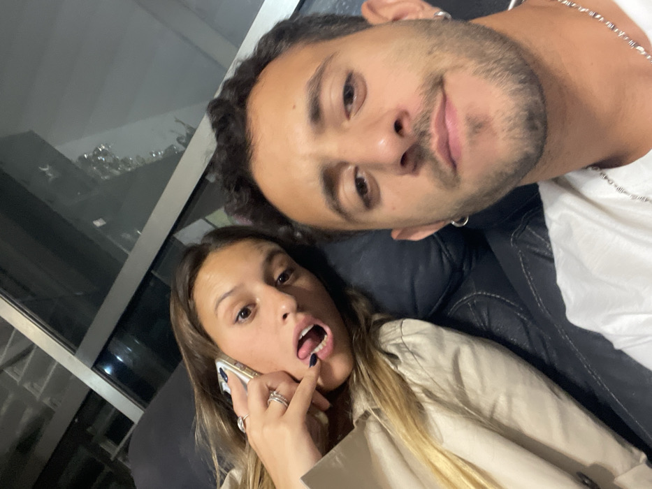 Two individuals, one female and one male, are depicted in a selfie-style photograph taken indoors at night or in low light. The female, positioned on the left, has long brown hair and is wearing a light-colored jacket. She is making a "call me" gesture with her right hand, holding a light-colored smartphone to her ear with her thumb and pinky finger extended, while simultaneously sticking out her tongue. Her nails are painted dark, and she wears multiple rings on her left hand. The male, positioned on the right and closer to the camera, has short dark curly hair and a beard. He is wearing a white t-shirt, a silver chain necklace, and two silver hoop earrings. He looks directly at the camera with a neutral expression. Both individuals appear to be seated on dark upholstered furniture, possibly a couch or vehicle seats. Large windows reflecting indistinct shapes or city lights are visible in the background. The location is an indoor setting in the city of Unknown, Unknown.