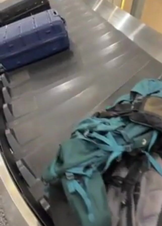 luggage carousel at an airport. A blue suitcase and a black suitcase travel on the carousel along with a jumble of backpacks. The backpacks are green and gray and appear to be hiking or camping gear. In the background, people are milling about.