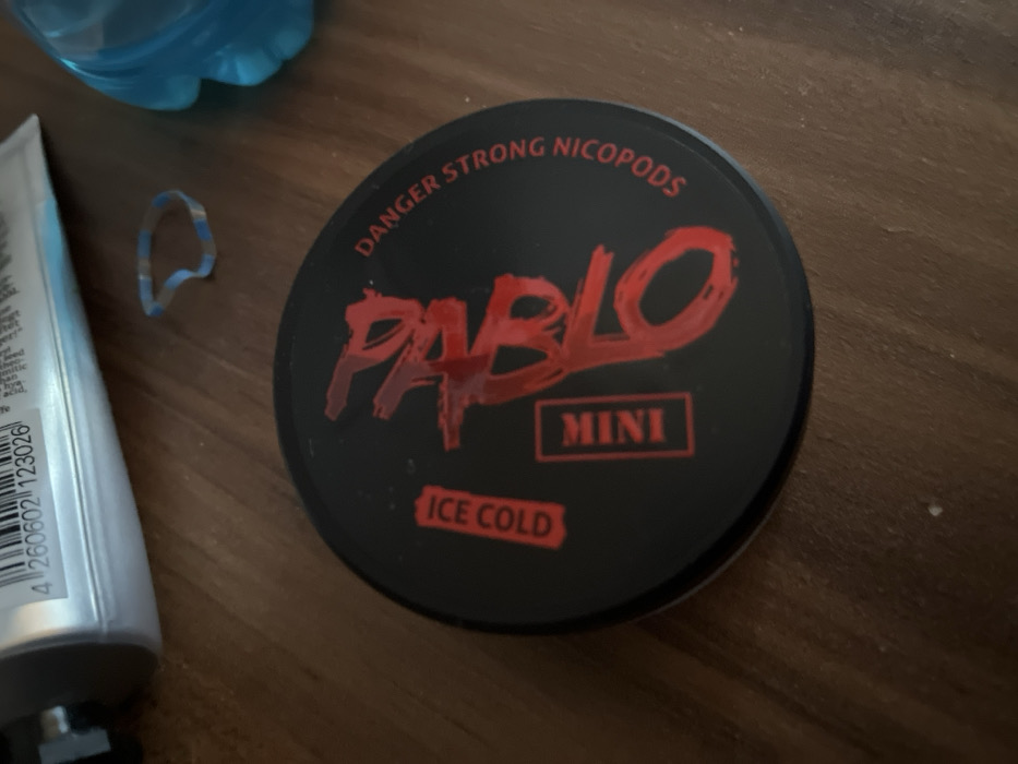 The scene depicts a collection of objects resting on a brown wooden surface with visible grain. In the foreground and central part of the image, a circular black container with a lid is prominently displayed. The lid features red lettering: "PABLO" in a large, textured font, "MINI" in a rectangular outline, "ICE COLD" in another rectangular outline, and "DANGER STRONG NICOPODS" curved along the upper right edge. To the upper left of the container, a portion of a silver or light gray tube is visible, displaying a black barcode with the number 4260602123026. To the upper right, a segment of a light blue plastic object, likely a bottle or container, is present. Between the tube and the blue object, an irregularly shaped, translucent item with light blue and white stripes, resembling a plastic or rubber band, is visible. No people, actions, or direct interactions are visible. The environment appears to be an indoor setting, possibly a table or desk. The specific location in Bad Nauheim, Germany, cannot be determined from the visual information provided within the image itself.
