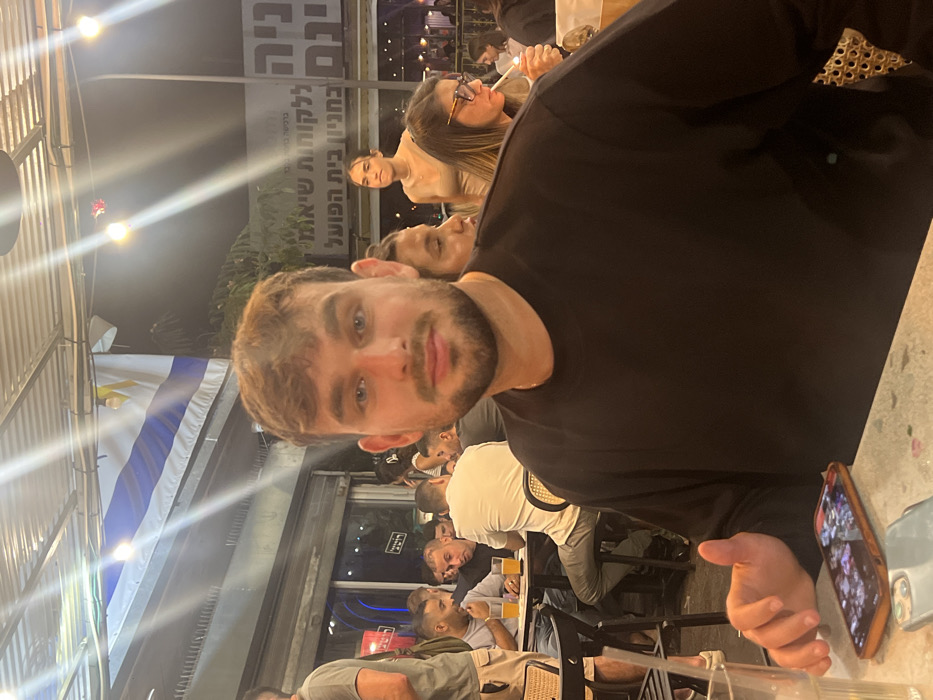 The image displays a nighttime scene within a bustling outdoor or semi-outdoor establishment, likely a bar or restaurant, located in the city of Unknown, Unknown. In the immediate foreground, a young adult male with light brown hair and a short beard, dressed in a black long-sleeved shirt, is seated at a table, looking directly forward. His right hand is visible on the table, positioned near two smartphones. In the background, numerous individuals are present, seated at various tables and engaged in social activities. To the left, several men are observed with drinks. To the right, a woman with dark hair and glasses is captured in the act of lighting a cigarette. Further back, another woman in a light-colored top stands. Overhead, a large Israeli flag, adorned with a yellow ribbon, is prominently displayed. Anti-bird spikes are visible on a ledge above the flag. Hebrew script is discernible on a building in the far background, including text that translates to "Beit HaPoel." The area is brightly illuminated by overhead lights, creating visible lens flares. The environment indicates a casual, busy social gathering.