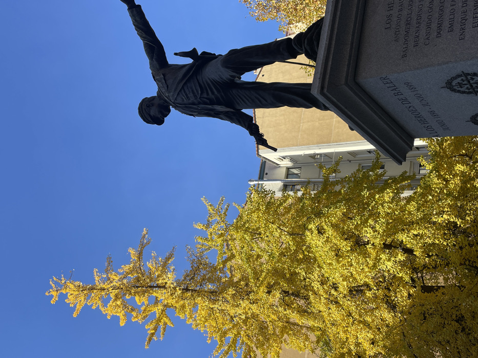 This image features a bronze statue of a male figure, likely a militiaman, mounted on a light-colored stone pedestal, located in the Plaza del Dos de Mayo, Madrid, Spain. The statue depicts the figure in a dynamic pose, wearing a cap, uniform jacket, and trousers, with a pistol held downwards in his right hand and his left arm extended horizontally. A rifle or musket is visible slung across his back. The pedestal is inscribed with "LOS HÉROES DE BALER JUNIO 1898 - JUNIO 1899" and lists of names. To the left of the statue, a tall tree with dense, vibrant yellow autumn foliage, consistent with a Ginkgo biloba, extends upwards against a clear, bright blue sky. In the background, sections of two multi-story urban buildings, one light beige and one lighter with visible windows, are partially visible. The entire scene is illuminated by strong natural sunlight.