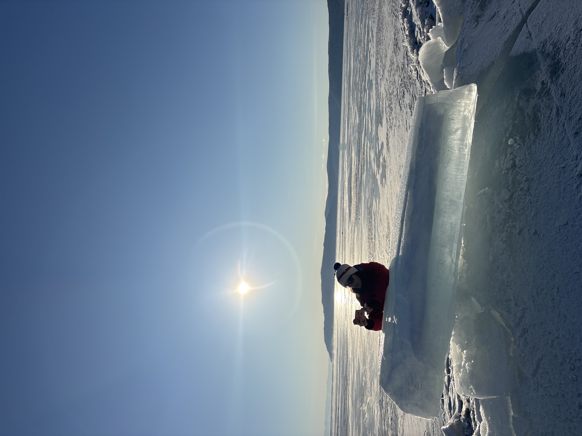The image displays a solitary individual positioned on the frozen surface of Lake Baikal, near Listvyanka, Russia, under a clear, bright blue sky. The low-lying sun is visible towards the upper center-left, generating a prominent lens flare and illuminating the scene from behind the subject. The individual is wearing a red winter jacket, dark trousers, sunglasses, and a red, white, and blue knit beanie with a pompom. They are lying semi-prone atop a large, elongated block of clear, translucent ice situated in the foreground. Both hands grasp a light-colored smartphone, which is directed towards the sun and the distant horizon, indicating an action of photography or video recording. Surrounding the primary ice block are several smaller, irregularly shaped chunks of clear ice, partially covered by snow and extending across the foreground. The vast expanse of the frozen lake, characterized by textured ice and snow patches, stretches towards a distant horizon. Low-lying, dark landmasses, consistent with hills or mountains, are visible along this horizon. The strong sunlight creates reflections on the ice and highlights its crystalline structure.