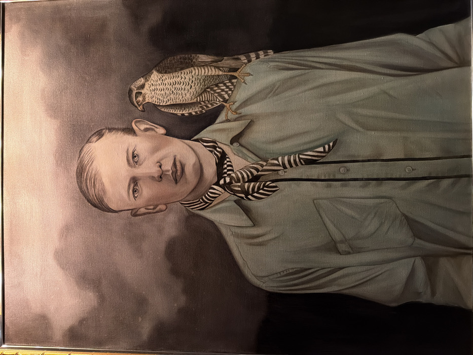 The image is a photograph of a framed oil painting. The painting depicts a head-and-shoulders portrait of a light-skinned adult male with short, light hair, who gazes directly forward. He wears a light greenish-grey collared long-sleeved shirt with buttons down the front and a visible pocket on the left chest. A black and white striped scarf is tied loosely around his neck. Perched on his right shoulder is a hawk or falcon, rendered with detailed brown, white, and black plumage, facing right. The background of the painting is dark and atmospheric, featuring indistinct, cloudy shapes in shades of grey and muted reddish-brown. The painting is enclosed within a gold-colored, possibly ornate, frame. The specific location of this painting in the city of London, United Kingdom, cannot be determined from the provided visual information.