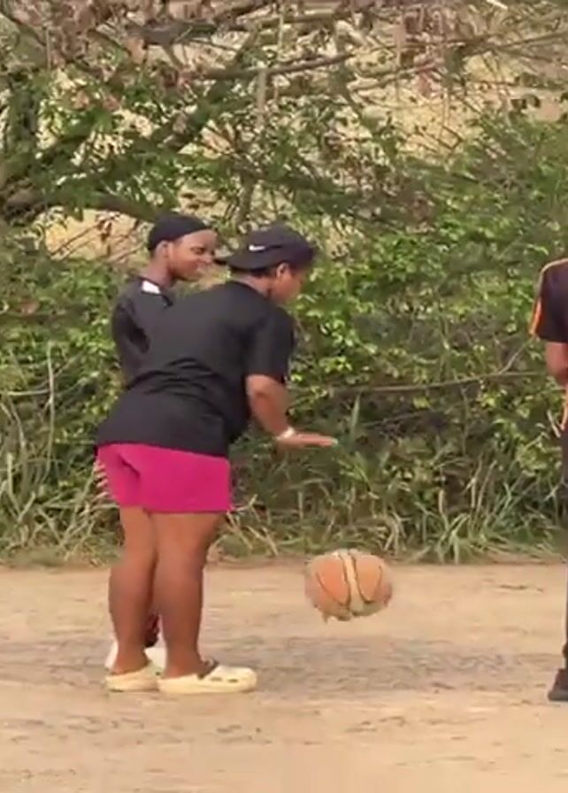 Three people are on a dirt basketball court. A person in a black t-shirt and pink shorts with a black baseball cap is dribbling a basketball. To her right is a person in a black t-shirt with white and blue markings on the chest and shoulders, and blue shorts. Behind them and to the right of the first person is a person in a black t-shirt with orange markings. The court is surrounded by green shrubbery.