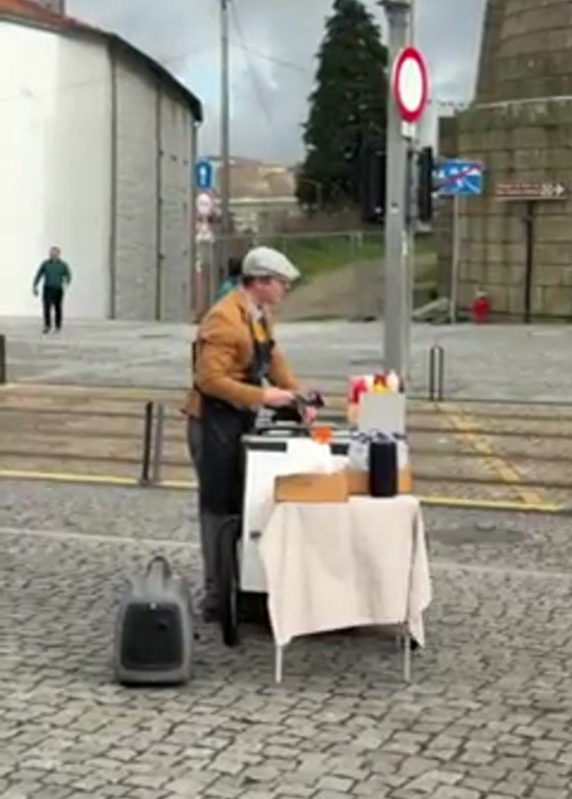 man working at a food cart on a cobblestone street. The man is wearing a brown jacket, grey pants, a grey newsboy cap, and a black apron. He is standing behind a white food cart with a beige cloth draped over a small table attached to the front. The cart has condiments and other supplies on top. A grey portable generator sits on the ground next to the cart. In the background, there are buildings, a traffic light, a tree, and other pedestrians walking by. There are also tram tracks running through the street. The sky is overcast. The man uses tongs to handle something on the cart's surface.