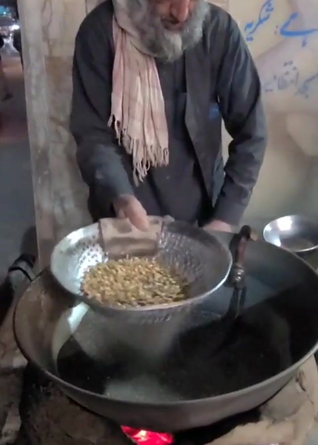 An elderly man with a white cap and beard is frying something in a large metal wok. He wears a dark jacket and a light patterned scarf around his neck. The wok sits on a stone structure with a visible red flame underneath. The man is using a round, silver-colored sieve to introduce small, yellowish pieces of food into the hot oil. The surrounding environment appears to be an indoor or semi-indoor area with tiled surfaces and writing on the wall in the background. There are other metal containers nearby, hinting at a possible food preparation area.