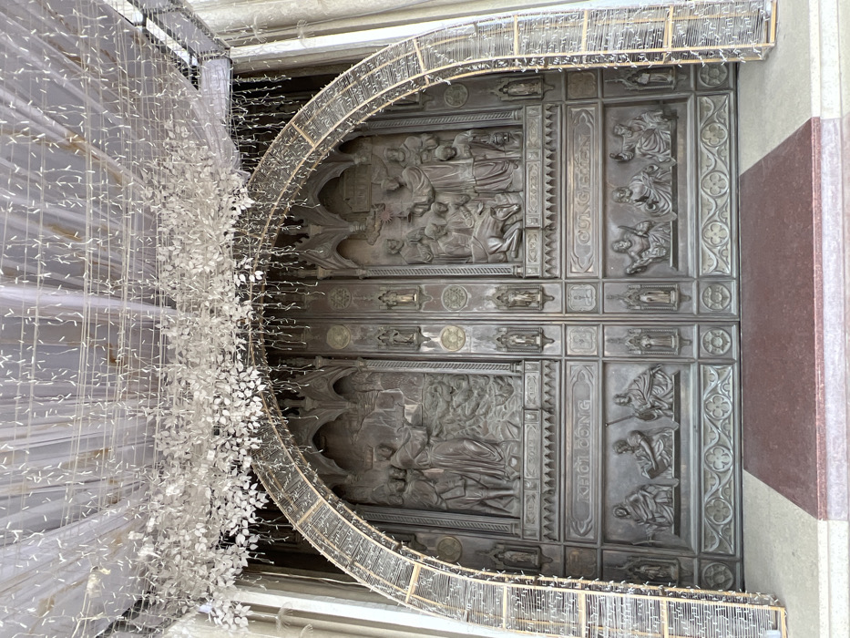 The image displays the main entrance of the Saigon Notre-Dame Basilica, located in District 1 of Ho Chi Minh City, Vietnam. The scene is dominated by large, double-leaf bronze doors, extensively embellished with relief sculptures. The upper sections of the doors feature large panels depicting biblical narratives; the left door shows figures, one receiving tablets from a divine source, while the right door portrays multiple figures gathered around a central figure, with one holding a star-like object. Below these, several smaller rectangular panels depict individual figures, likely apostles or saints, in various poses. The Vietnamese text "KHỞI ĐỘNG" (Begin) and "CUNG HIẾN" (Dedication/Consecration) is engraved across the mid-section of the doors. Framing the bronze doors is a large, arched structure composed of a light-colored framework wrapped with horizontal strips, illuminated by numerous small white string lights. Above the entire entrance, a canopy is elaborately decorated with draped white fabric, multiple strands of hanging white fairy lights, and clusters of artificial white leaves, creating a cascading effect. A rectangular reddish-brown mat is laid directly on the steps in front of the doors, leading to a lighter-colored stone landing. The surrounding architectural elements of the building appear to be light-colored stone. No individuals are present in the depicted scene.