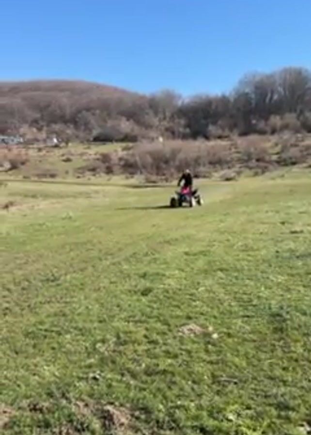person riding a red ATV across a grassy field on a sunny day. The rider is wearing a helmet and dark clothing. The ATV moves across the grass, kicking up some dirt. In the background, there are rolling hills covered with sparse trees and shrubbery under a clear blue sky.