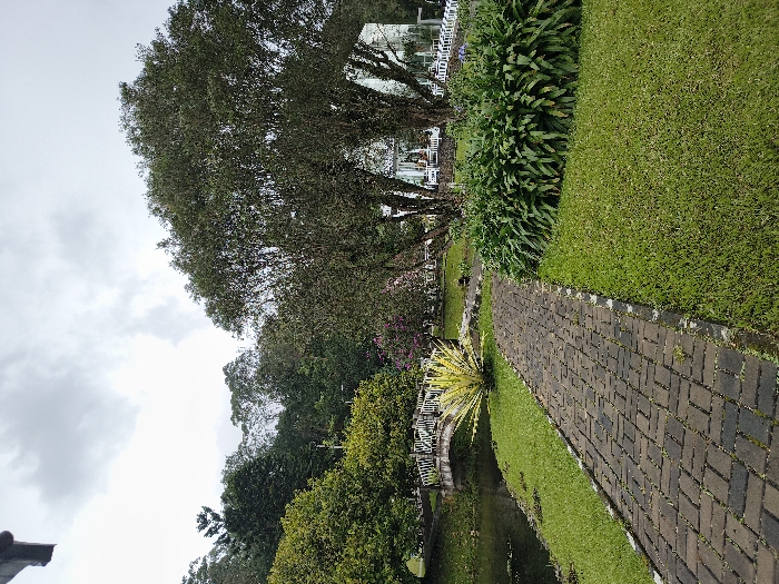 A brick pathway stretches toward a lush green landscape. A small white bridge spans a pond, flanked by trees and vibrant shrubbery. Well-manicured lawns extend to the right of the path, and dense foliage grows nearby. In the distance, a building with white railings is partially visible, framed by a large tree. The sky is overcast, casting a soft light over the scene.