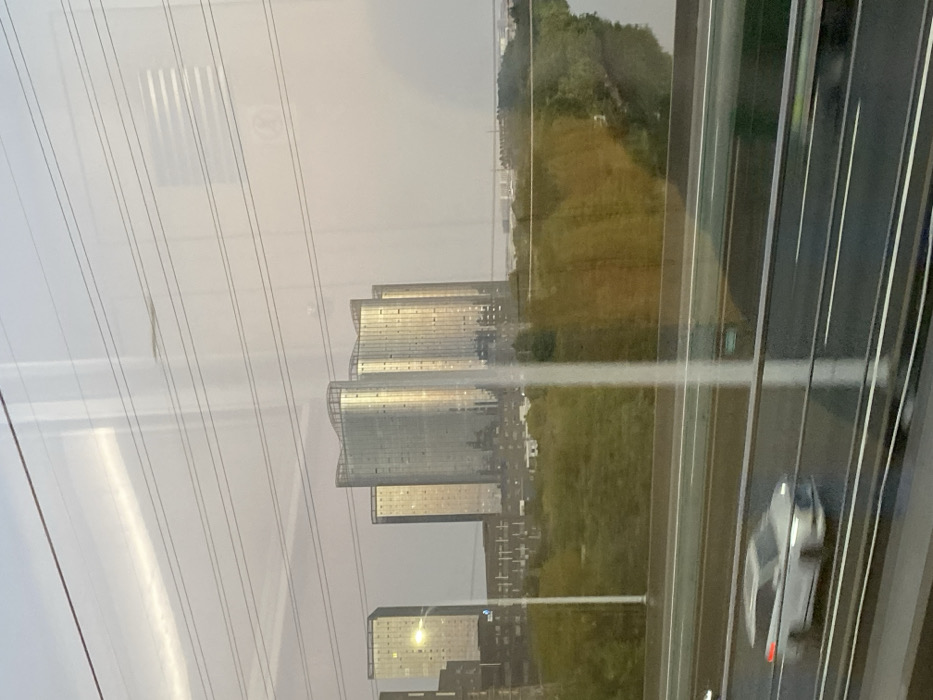 - "The image presents an external view from a moving vehicle, likely a train, through a window pane exhibiting reflections of internal light sources and patterns" by FM-y52303, licensed under CC BY 4.0