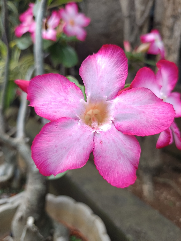 The image displays a close-up, shallow-depth-of-field photograph centered on a single Adenium obesum (desert rose) flower. This prominent flower features five petals, transitioning from vibrant fuchsia pink at their outer edges to a paler pink and white towards the central, slightly yellowed pistil and stamens. Minor dark specks are visible on some petals. In the blurred background, several other Adenium obesum flowers with similar pink hues are discernible, along with out-of-focus green foliage and gnarled, grayish-brown plant stems. The lower-left foreground shows a blurred portion of a light-colored, possibly scalloped, ceramic or plastic pot. A dark, textured, vertical surface, resembling wood or concrete, forms the background behind the flowers, particularly on the right side. Natural, diffused lighting illuminates the scene. No people, actions, or interactions are depicted. The specific location in Ouderkerk aan de Amstel, Netherlands, cannot be determined from the visual information provided within the image.