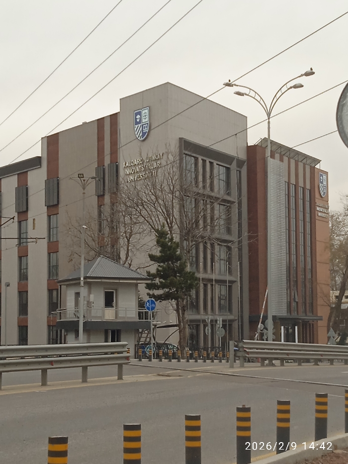 The image displays the exterior of a modern, multi-story building identified by its facade text as "XALQARO JITINOY INNOVATSIYALAR UNIVERSITETI" (International Innovative University) in Yalangach, Uzbekistan. The building's architecture combines light gray paneling with vertical dark reddish-brown sections and extensive fenestration featuring tall, narrow windows. Two blue and white university crests are prominently affixed to the upper facade. In the foreground, an asphalt road with a series of black and yellow striped bollards and a gray metal guardrail separates the viewer from the university grounds. A smaller, two-story structure with a gray peaked roof and a second-level balcony, possibly a guardhouse, stands between the road and the main university building. Bare deciduous trees and one evergreen coniferous tree are visible. Overhead utility wires and a street light fixture are present in the upper frame. A pedestrian crossing sign is visible near the smaller structure, and a red and white barrier arm is partially visible on the right, controlling access. No individuals are depicted. The scene is captured under an overcast sky, with a timestamp of 2026/2/9 14:42 embedded in the lower right corner.