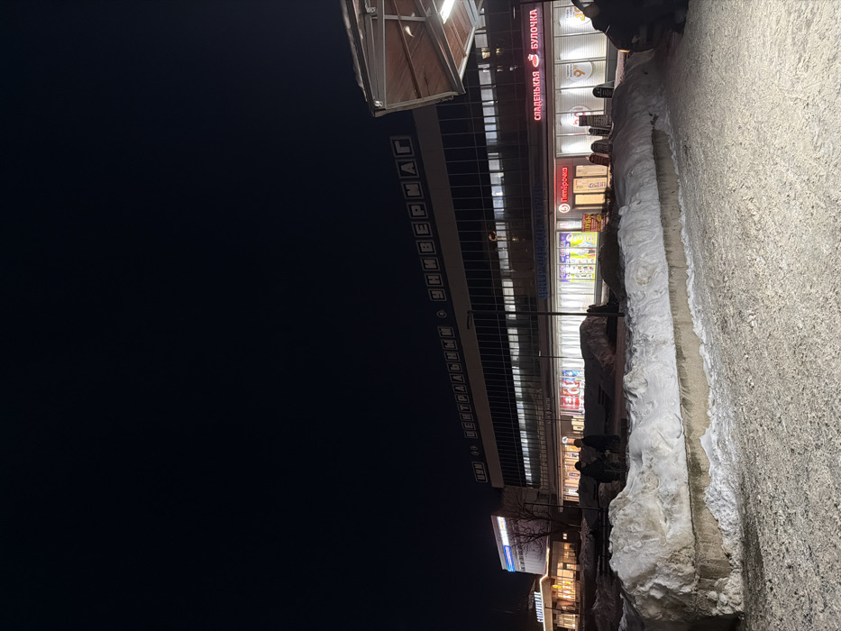 A nighttime view of a multi-story building with illuminated storefronts. The side of the building has Cyrillic text running vertically. A sidewalk covered with snow and ice runs along the bottom right edge of the image. The sky is dark and featureless, contrasting with the bright lights of the building. A couple of people are walking in front of the stores. The angle is slightly tilted.